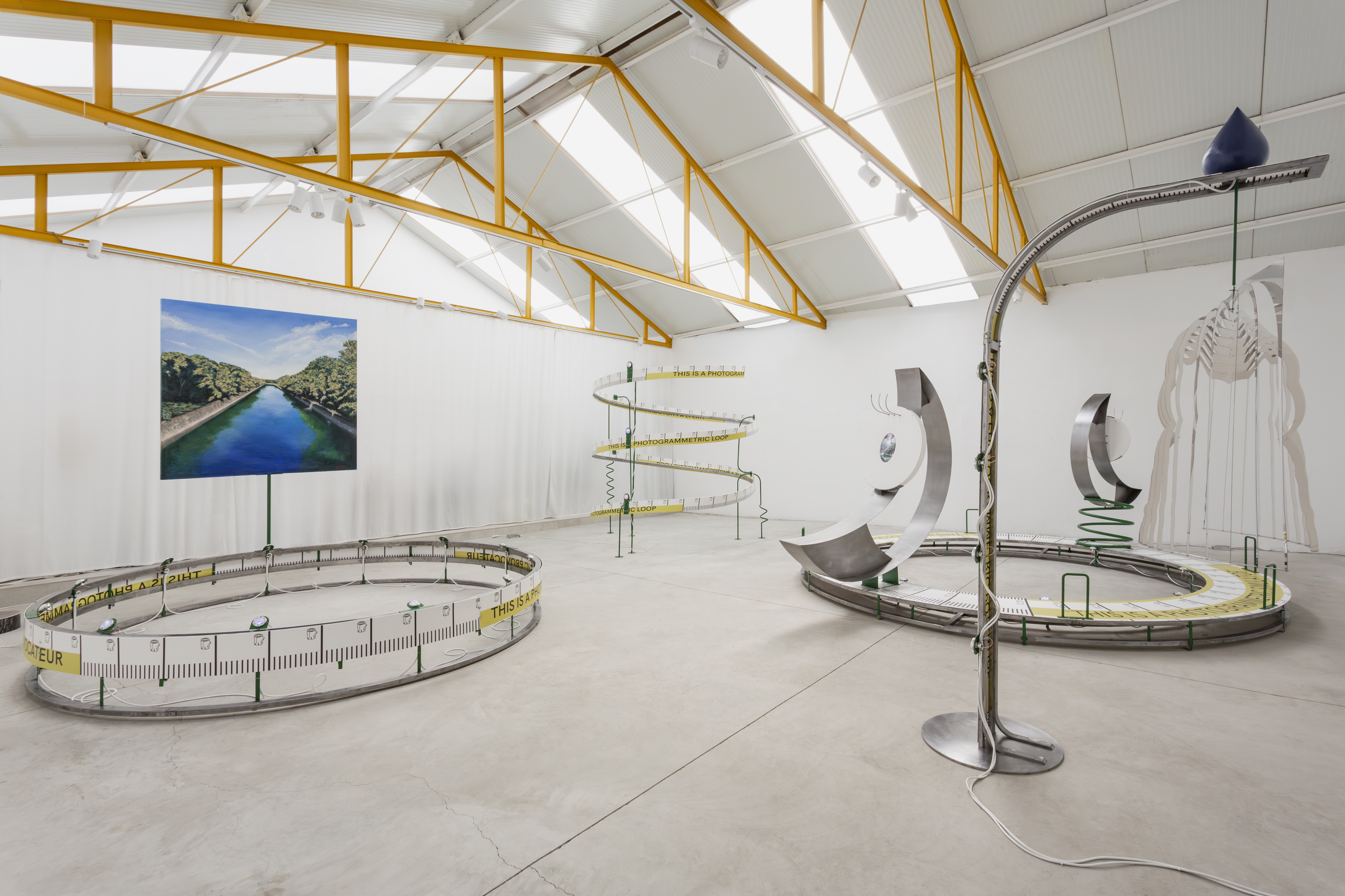 → Instalación. Hierro, MDF, plancha de acero inoxidable, ruedines, fórex impreso, PLA, apliques de luz de feria, cables, cuadro al óleo por Jose María Arriazu.