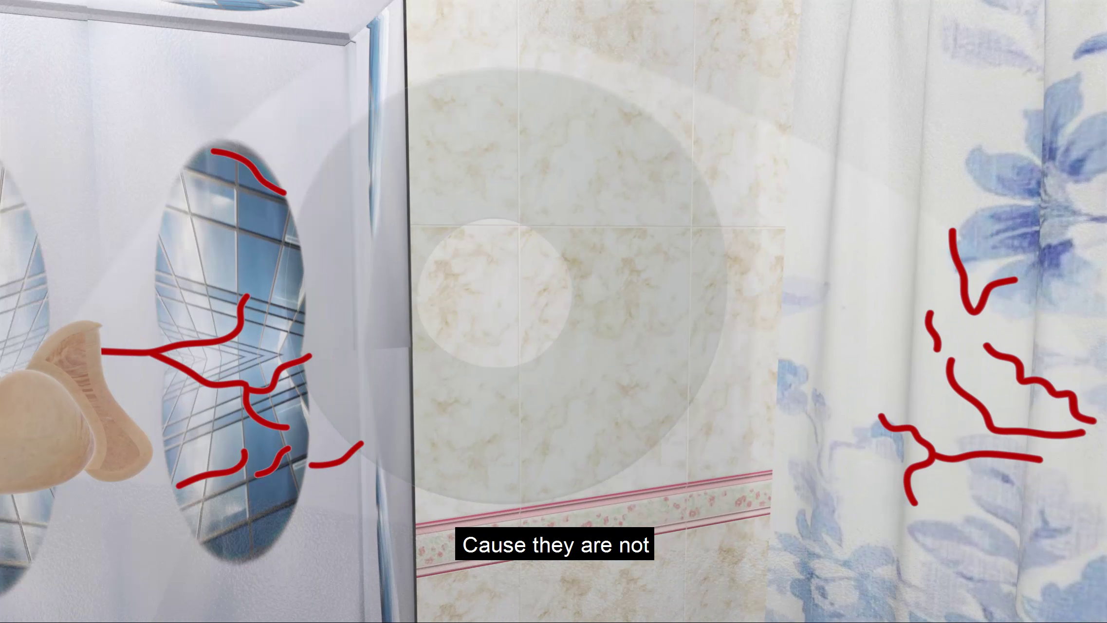 Las fugas reflejadas en la reflexión del cristal desvelan lo no deseado. Desvelan a escalas dispares. Una grabación doméstica al encontrarse con el espejo nos lleva a esquinas fuera de control de encuadre. Ana Mari nos enseña su casa, y al mismo tiempo piensa. Su casa son mesas de melanina descascarillada. Muebles de televisión vacíos que desbordan presencia en salones reducidos. Toallas amarillentas húmedas que esperan colgadas a perder el resto de agua que alguna vez estuvo en un cuerpo. Cortinas de ducha enmohecidas por la misma humedad que nunca se fue. La falta de control en la reflexión del espejo, del cristal, es una realidad vital, compartida, cercana.
